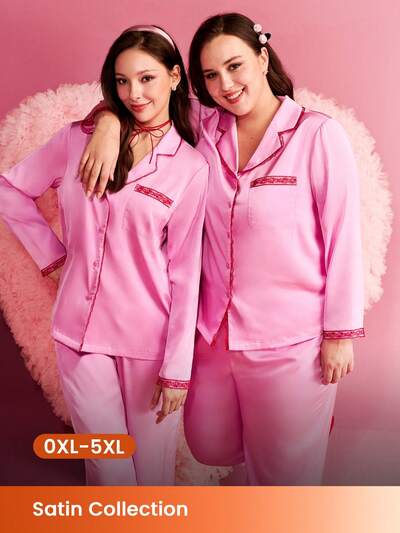 Plus Size Satin Button-Up Top & Pants PJ Set-30%