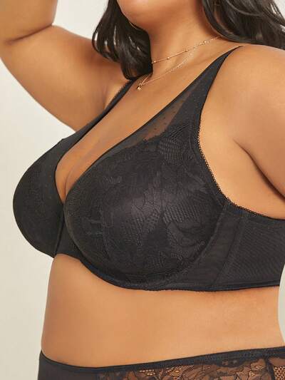 Große Größen Schwarze Sexy Wäsche mit voller Abdeckung, Push-Up, Spitze Eleganz & Mesh BH