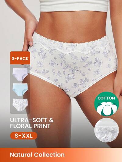 Paquete de 3 bragas de mujer de algodón suave con estampado floral y ribete de encaje a media cintura, ropa interior ligeraConjunto de pijama de satén con ribete de encaje para mujer para otoño e invierno, ropa de lencería y ropa de estar en casa
