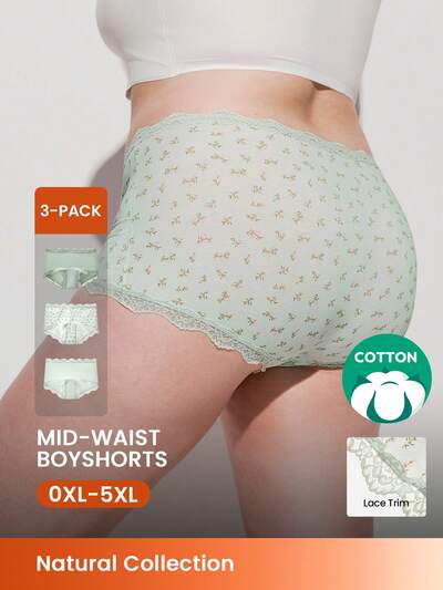 3 paquets de culottes courtes de base à taille haute en coton avec garniture en dentelle - Imprimé floral avec garniture en dentelle - Vert