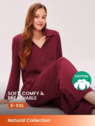 クリスマス & 新年 パジャマ カップル ベーシック ソフト レッド & バーガンディー 100% ピュアコットン レース トリム ボタンアップ & パンツ ラウンジウェア パジャマセット レディース ルームウェア セット レディース ランジェリー 秋冬ファッション