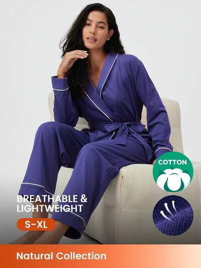 秋冬 ソフト 100%コットン ベーシック レディースパジャマセット 長袖 ウエストリボン トップス&パンツ レディースルームウェアセット 秋冬パジャマ-30%